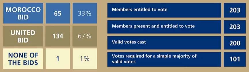 WK 2026 is toegewezen aan Canada, Mexico en de Verenigde Staten. Noord-Amerika kreeg met 134 stemmen een meerderheid van 67%, terwijl Marokko 33% kreeg.